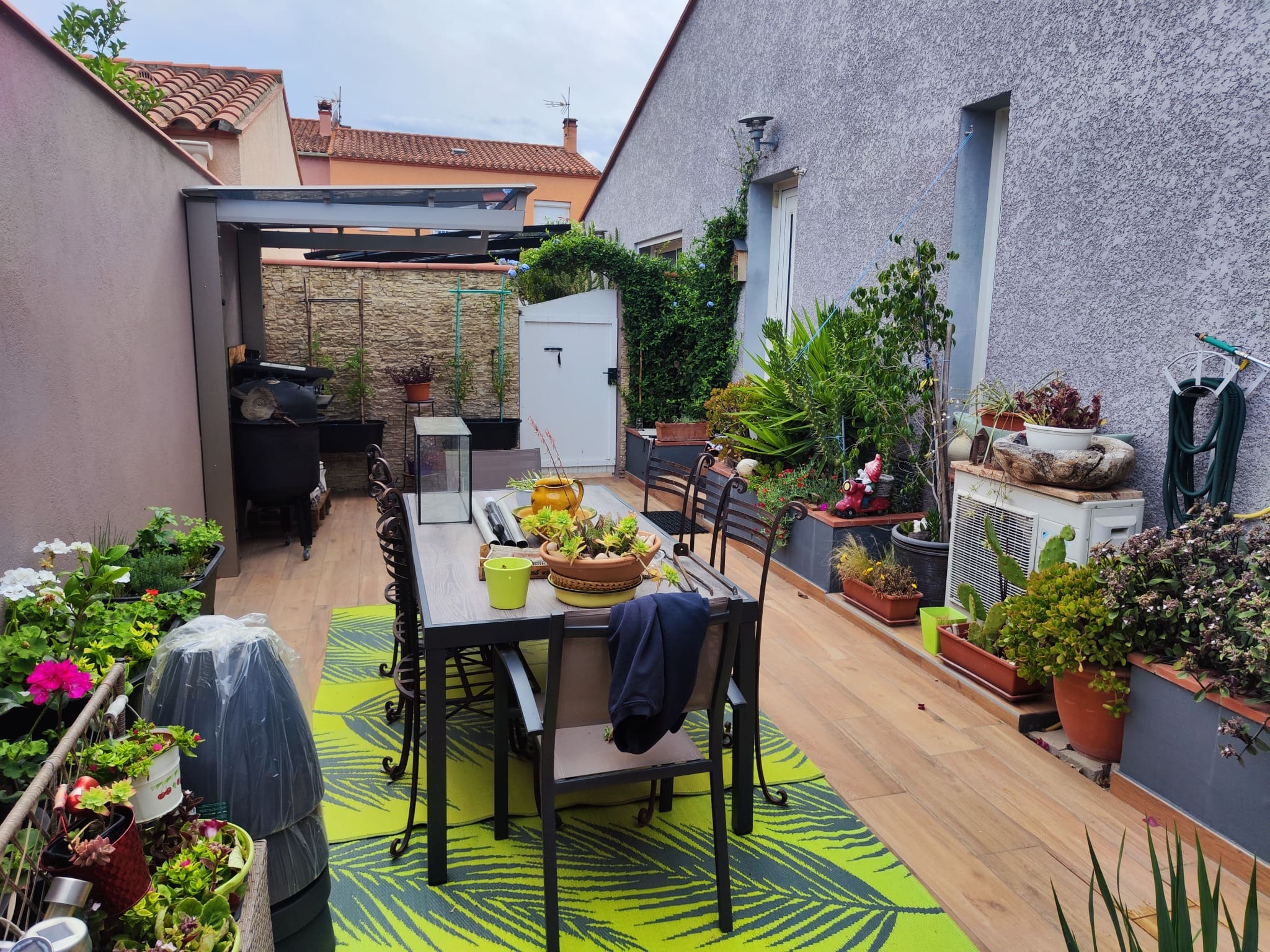 Sur la photo ci-dessus, notre client a transformé un abri compact en carport barbecue au fond de sa terrasse. Placé stratégiquement contre un mur, ce petit abri de structure la zone cuisson tout en apportant une touche moderne et épurée. Protégé des intempéries, le barbecue reste accessible toute l’année, même en cas de pluie ou de forte chaleur. L’ensemble crée une véritable cuisine d’été parfaitement intégrée au jardin, avec un coin repas abrité à proximité, idéal pour recevoir des invitées ou profiter en famille d’un repas en plein air.